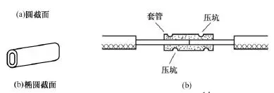 (1)铜导线或铝导线的紧压连接。压接套管截面有圆形和椭圆形两种,如图12所示。圆截面套管内可以穿入一根导线,椭圆截面套管内可以并排穿入两根导线。