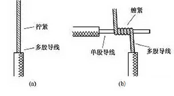 (5)单股铜导线与多股铜导线的连接。单股铜导线与多股铜导线的连接方法如图9所示,先将多股导线的芯线绞合拧紧成单股状,再将其紧密缠绕在单股导线的芯线上5~8圈,最后将单股芯线线头折回并压紧在缠绕部位即可。