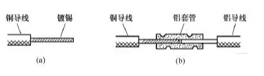 另一种方法是将铜导线镀锡后采用铝套管连接。由于锡与铝的标准电极电位相差较小,在铜与铝之间夹垫一层锡也可以防止电化腐蚀。具体做法是先在铜导线的芯线上镀上一层锡,再将镀锡铜芯线插入铝套管的一端,铝导线的芯线插入该套管的另一端,最后压紧套管即可,如图16所示。