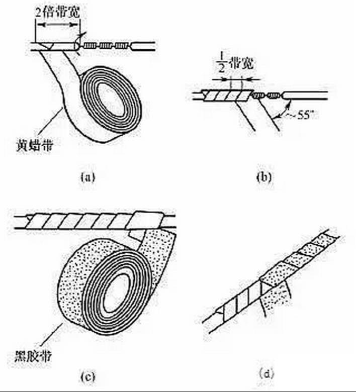 导线连接处的绝缘处理通常采用绝缘胶带进行缠裹包扎。一般电工常用的绝缘带有黄蜡带、涤纶薄膜带、黑胶布带、塑料胶带、橡胶胶带等。绝缘胶带的宽度常用20mm的,使用较为方便。