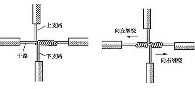 单股铜导线的十字分支连接如图5所示,将上下支路芯线的线头紧密缠绕在干路芯线上5~8圈后剪去多余线头即可。可以将上下支路芯线的线头向一个方向缠绕[见图5(a)],也可以向左右两个方向缠绕[见图 5(b)]。