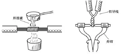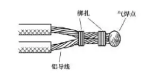 气焊是指利用气焊枪的高温火焰,将铝芯线的连接点加热,使待连接的铝芯线相互熔融连接。气焊前应将待连接的铝芯线绞合,或用铝丝或铁丝绑扎固定,如图19所示。