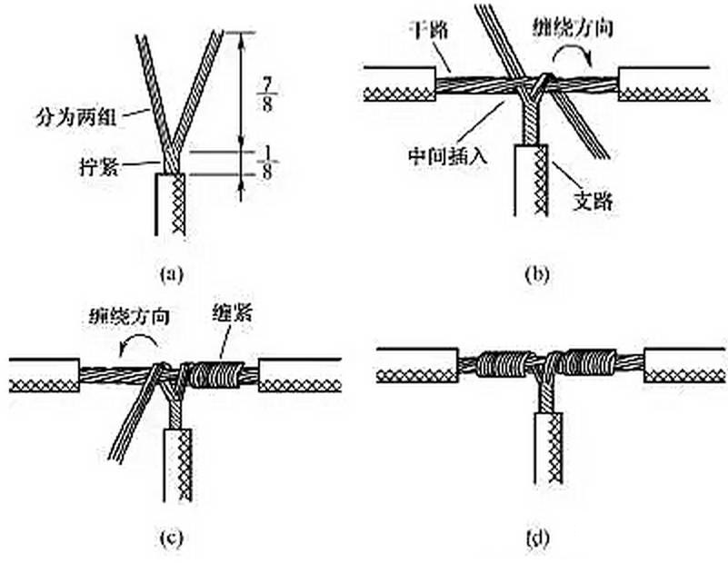 另一种方法如图8所示,将支路芯线靠近绝缘层的约1/8芯线绞合拧紧,其余7/8芯线分为两组[见图8(a)],一组插入干路芯线当中,另一组放在干路芯线前面,并朝右边按图8(b)所示方向缠绕 4~5圈。再将插入干路芯线当中的那一组朝左边按图8(c)所示方向缠绕4~5圈,连接好的导线如图8(d)所示。