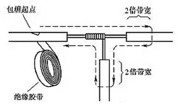 导线分支接头的绝缘处理基本方法同上,T字分支接头的包缠方向如图21所示,走一个T字形的来回,使每根导线上都包缠两层绝缘胶带,每根导线都应包缠到完好绝缘层的两倍胶带宽度处。