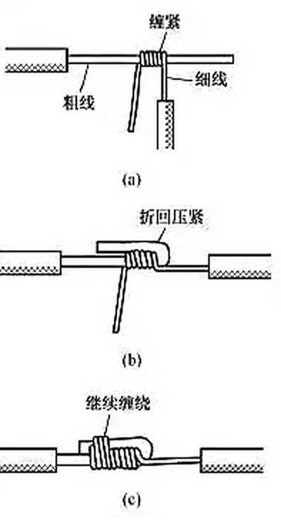 不同截面单股铜导线连接方法如图3所示,先将细导线的芯线在粗导线的芯线上紧密缠绕 5~6圈,然后将粗导线芯线的线头折回紧压在缠绕层上,再用细导线芯线在其上继续缠绕3~4圈后剪去多余线头即可。