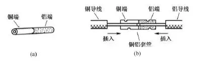 一种方法是采用铜铝连接套管。铜铝连接套管的一端是铜质,另一端是铝质,如图15(a)所示。使用时将铜导线的芯线插入套管的铜端,将铝导线的芯线插入套管的铝端,然后压紧套管即可,如图15(b)所示。