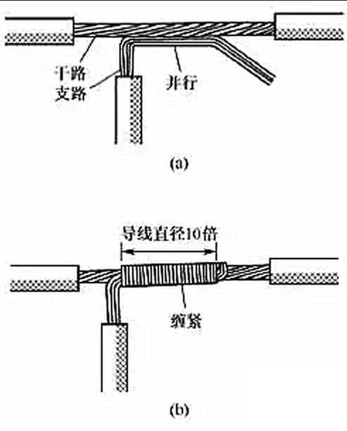 (4)多股铜导线的分支连接。多股铜导线的T字分支连接有两种方法,一种方法是将支路芯线90°折弯后与干路芯线并行[见图7(a)],然后将线头折回并紧密缠绕在芯线上即可[见图7(b)]。